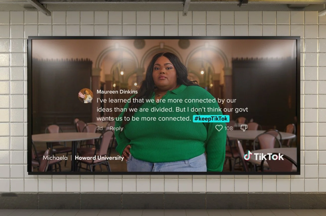 In late 2022, the U.S. Government moved to ban TikTok on U.S. college campuses. We reacted to the news as it happened, interviewing 26 students and professors from across the country in 2 shoots, to show the positive impact TikTok has had on their lives. The work spanned film, print and targeted OOH in key states and across Washington, D.C. during the Congress hearing.